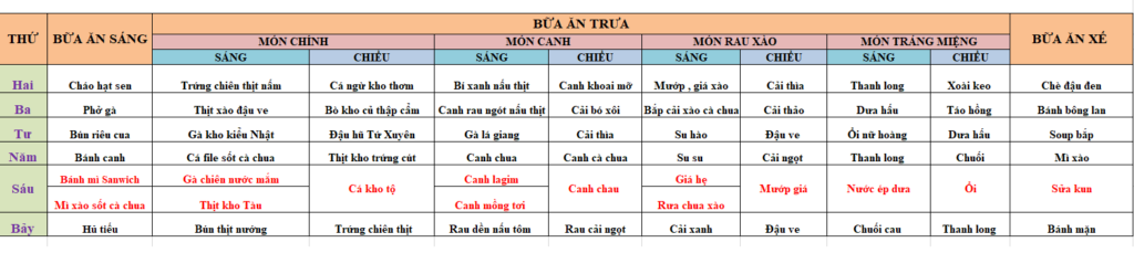 THỰC ĐƠN TỪ NGÀY 13 ĐẾN NGÀY 17 THÁNG 10